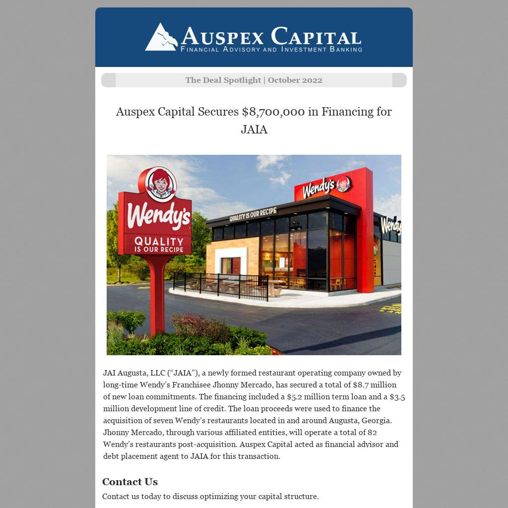 JAI Augusta, LLC (“JAIA”), a newly formed restaurant operating company owned by long-time Wendy’s Franchisee Jhonny Mercado, has secured a total of $8.7 million of new loan commitments. The financing included a $5.2 million term loan and a $3.5 million development line of credit. The loan proceeds were used to finance the acquisition of seven Wendy’s restaurants located in and around Augusta, Georgia. Jhonny Mercado, through various affiliated entities, will operate a total of 82 Wendy’s restaurants post-acquisition. Auspex Capital acted as financial advisor and debt placement agent to JAIA for this transaction.