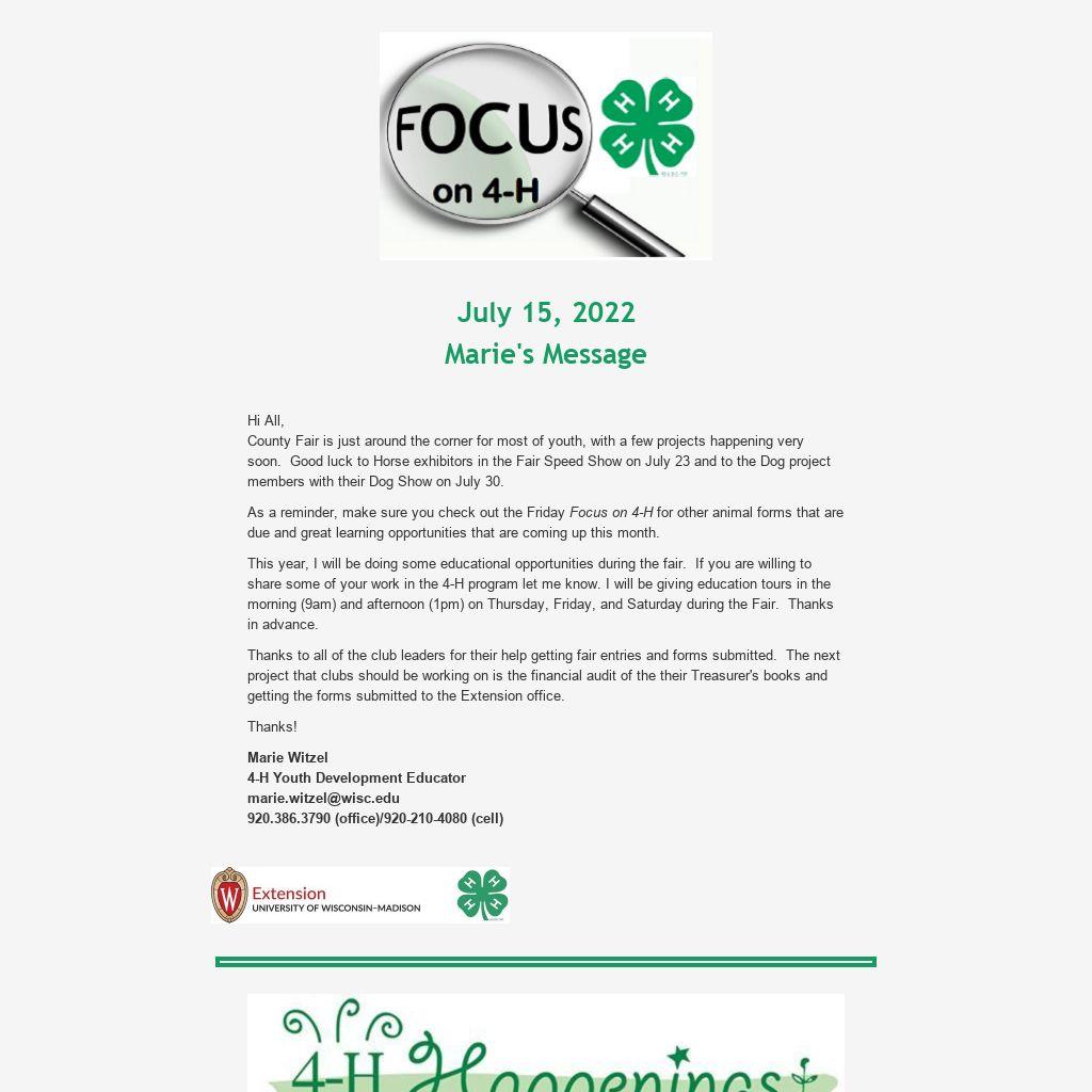 Donations of 'FISH" are needed for the 4-H Fish Pond! Please have all prizes submitted to Jan Zander by July 25th. Contact Janet Zander at 920-382-9499 with any questions.