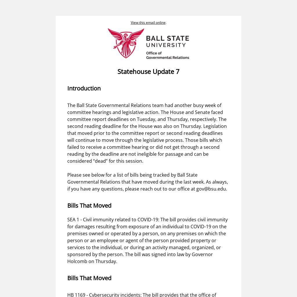 Please see below for a list of bills being tracked by Ball State Governmental Relations that have moved during the last week. As always, if you have any questions, please reach out to our office at gov@bsu.edu.