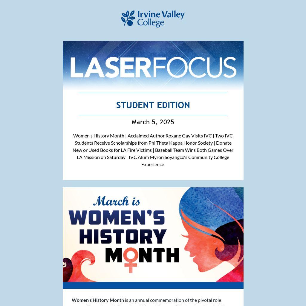 Women's History Month | Acclaimed Author Roxane Gay Visits IVC | Two IVC Students Receive Scholarships from Phi Theta Kappa Honor Society | Donate New or Used Books for LA Fire Victims | Baseball Team Wins Both Games Over LA Mission on Saturday | IVC Alum Myron Soyangco's Community College Experience