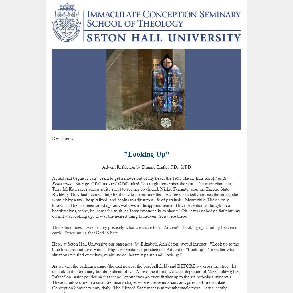 Here, at Seton Hall University, our patroness, St. Elizabeth Ann Seton, would instruct: "Look up to the blue heavens and love Him.” Might we make it a practice this Advent to “Look up.” No matter what situations we find ourselves, might we deliberately pause and “look up.”