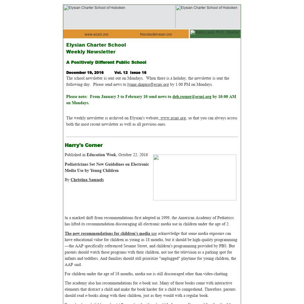 The weekly newsletter is archived on Elysian's website, www.ecsnj.org, so that you can always access both the most recent newsletter as well as all previous ones.