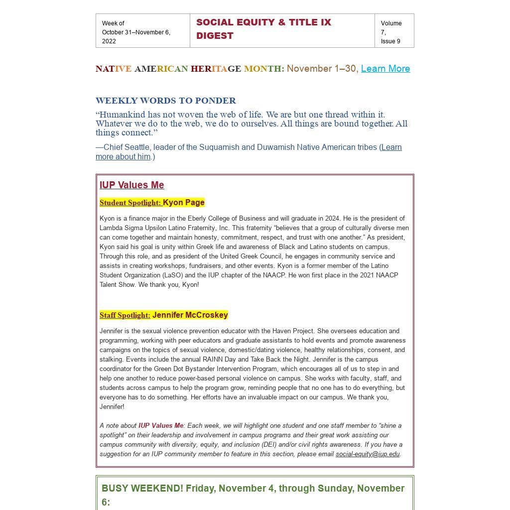 Digest issues are emailed every Monday morning. Send all information concerning your event to social-equity@iup.edu, and we will include it in the appropriate weekly issue. Also, please be sure to enter your event in the CMS on the DIVERSITY, STUDENT, and CENTRAL CALENDARS so that it will receive wider marketing, appear in IUP Now, and achieve greater attendance.