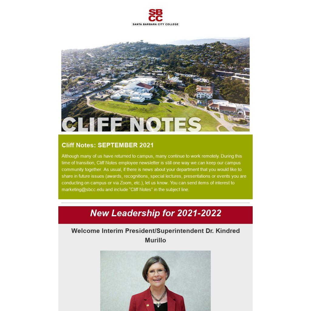 Although many of us have returned to campus, many continue to work remotely. During this time of transition, Cliff Notes employee newsletter is still one way we can keep our campus community together. As usual, if there is news about your department that you would like to share in future issues (awards, recognitions, special lectures, presentations or events you are conducting on campus or via Zoom, etc.), let us know. You can send items of interest to marketing@sbcc.edu and include “Cliff Notes” in the subject line.