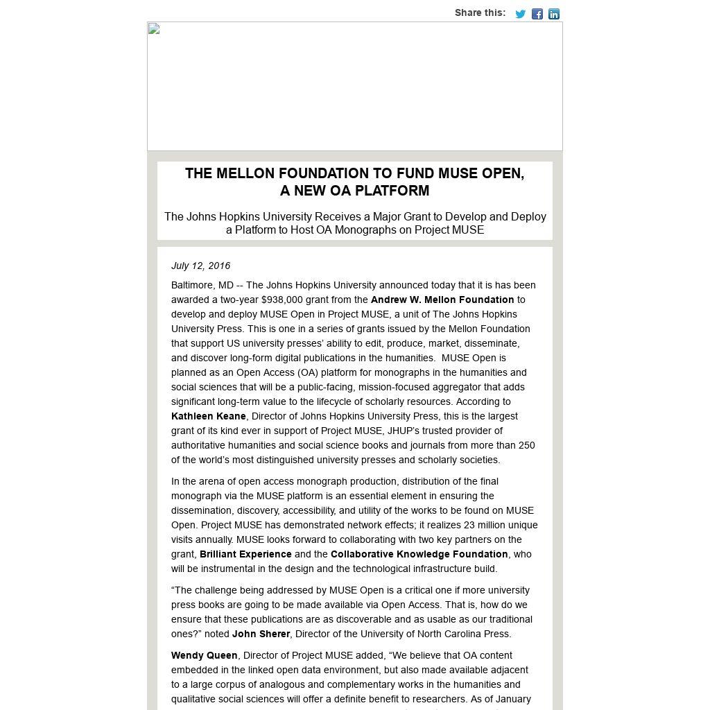 Baltimore, MD -- The Johns Hopkins University announced today that it is has been awarded a two-year $938,000 grant from the Andrew W. Mellon Foundation to develop and deploy MUSE Open in Project MUSE, a unit of The Johns Hopkins University Press. This is one in a series of grants issued by the Mellon Foundation that support US university presses’ ability to edit, produce, market, disseminate, and discover long-form digital publications in the humanities. MUSE Open is planned as an Open Access (OA) platform for monographs in the humanities and social sciences that will be a public-facing, mission-focused aggregator that adds significant long-term value to the lifecycle of scholarly resources. According to Kathleen Keane, Director of Johns Hopkins University Press, this is the largest grant of its kind ever in support of Project MUSE, JHUP’s trusted provider of authoritative humanities and social science books and journals from more than 250 of the world’s most distinguished university presses and scholarly societies.
