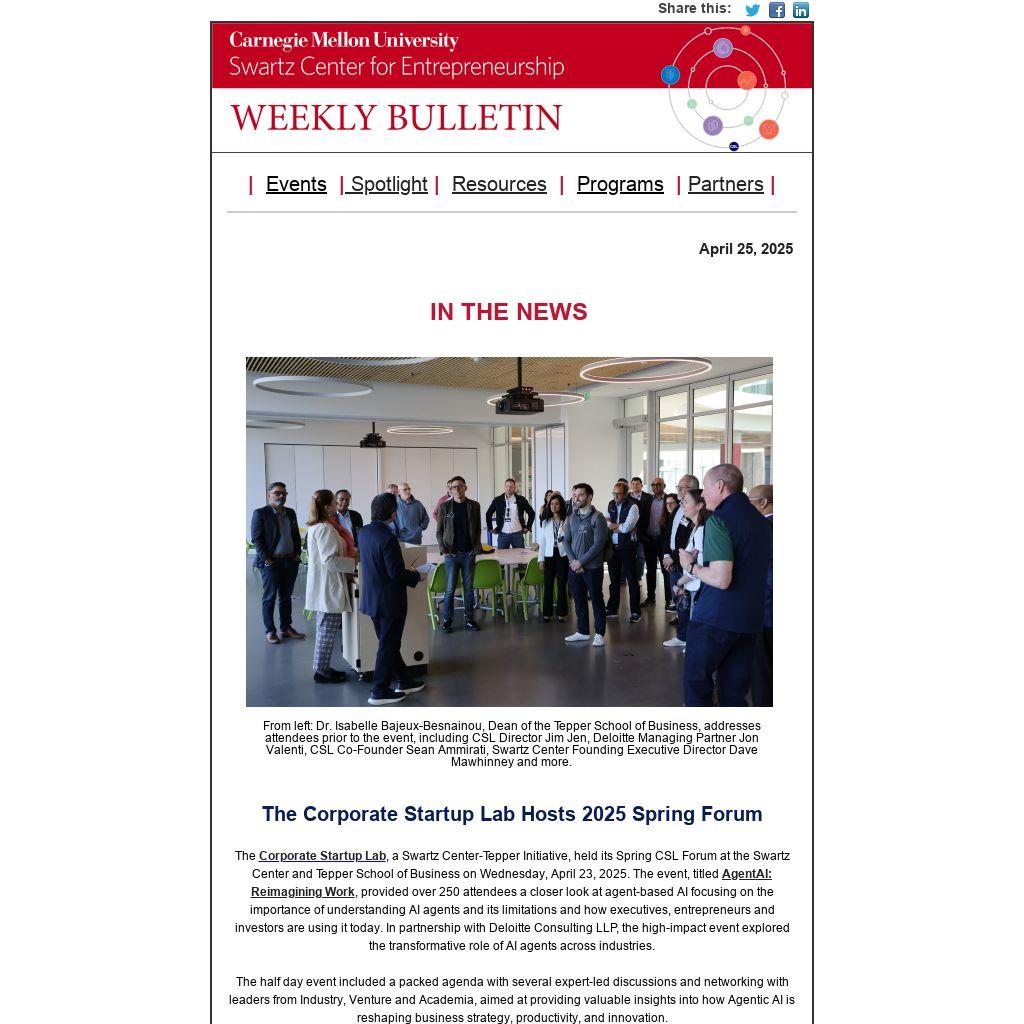 Have startup news or opportunities to share? Have questions about the Swartz Center Weekly Bulletin? Send news, opportunities or questions to Sonya Ford, Program Manager.