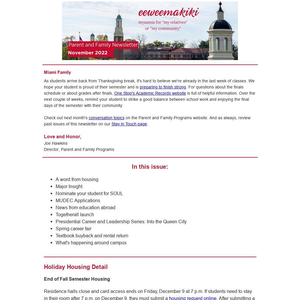 Check out next month's conversation topics on the Parent and Family Programs website. And as always, review past issues of this newsletter on our Stay in Touch page.