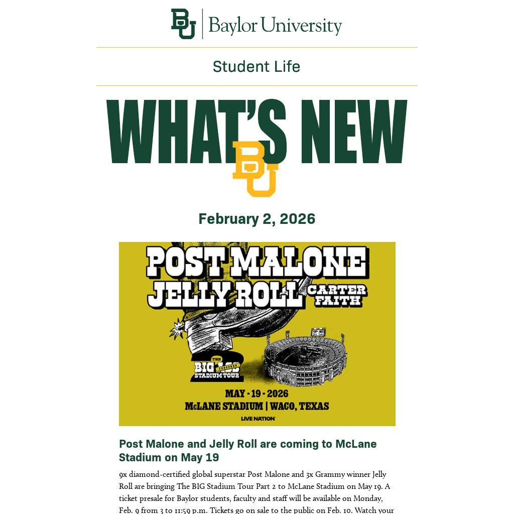 9x diamond-certified global superstar Post Malone and 3x Grammy winner Jelly Roll are bringing The BIG Stadium Tour Part 2 to McLane Stadium on May 19. A ticket presale for Baylor students, faculty and staff will be available on Monday, Feb. 9 from 3 to 11:59 p.m. Tickets go on sale to the public on Feb. 10. Watch your Baylor email on Feb. 9 for more about how to buy tickets in the presale.