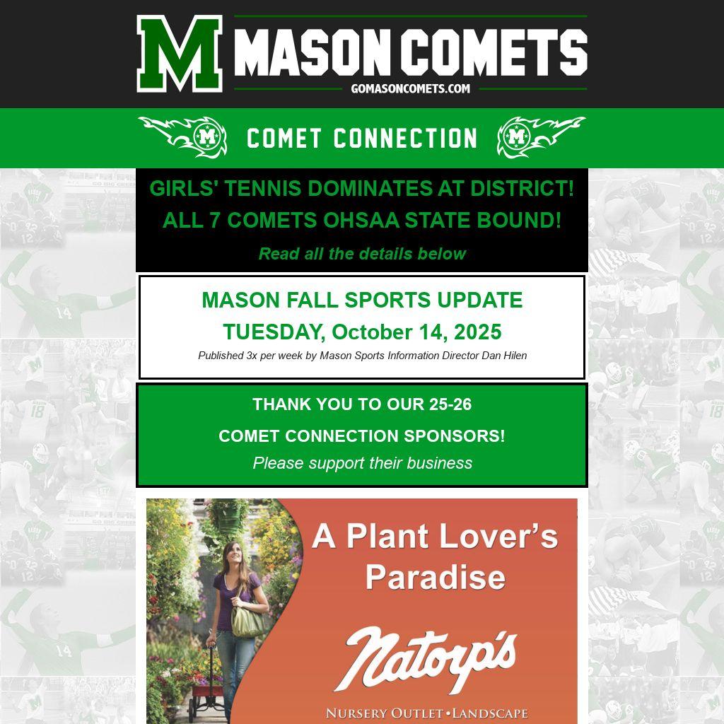 In addition to individual success, the Comets have also earned a berth in the OTCA Team Final Four, which will be played Saturday, October 18, at Mason High School beginning at 8:00 AM. This marks Mason’s 11th straight Final Four appearance as the Comets pursue their ninth consecutive State Team Championship.