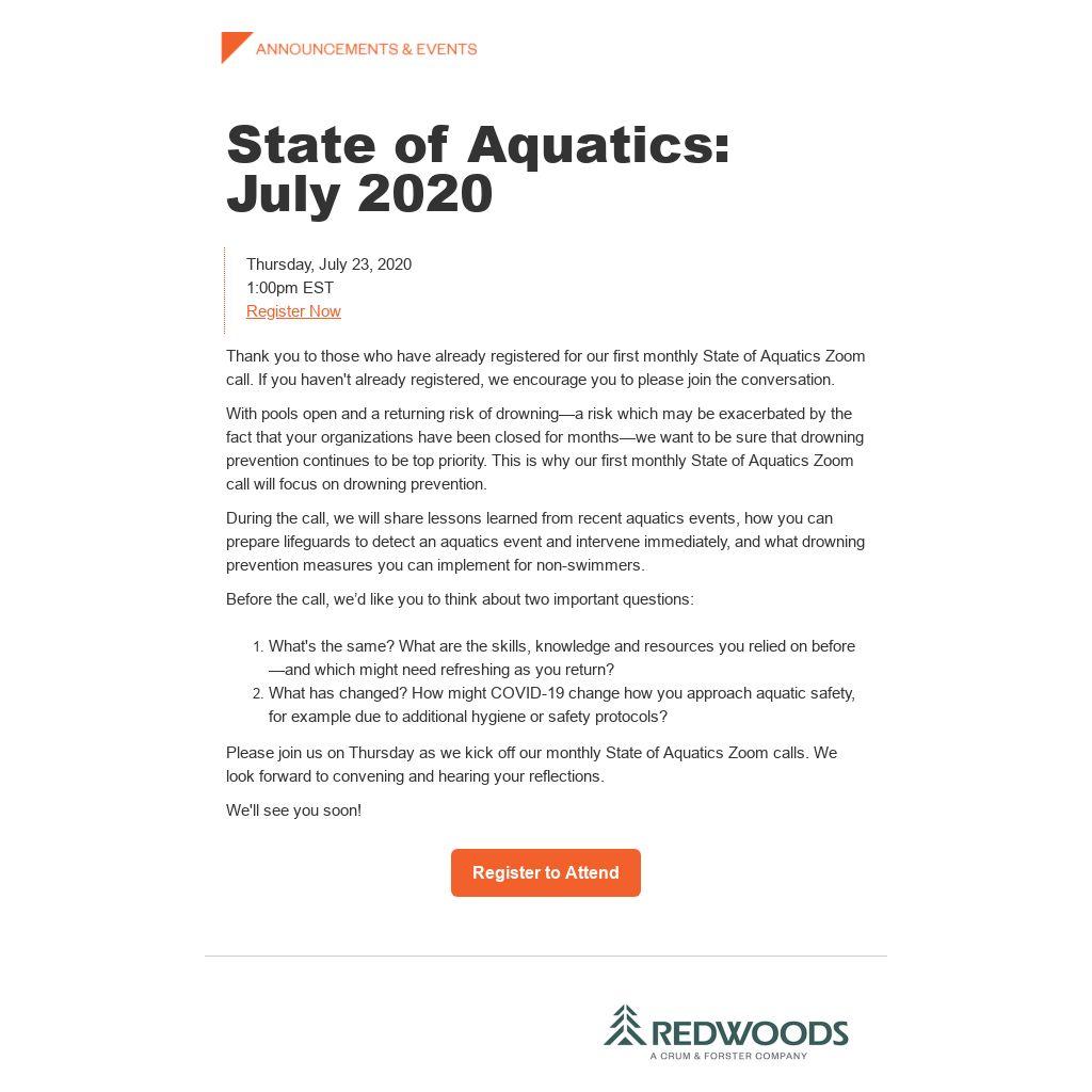 Thank you to those who have already registered for our first monthly State of Aquatics Zoom call. If you haven't already registered, we encourage you to please join the conversation.