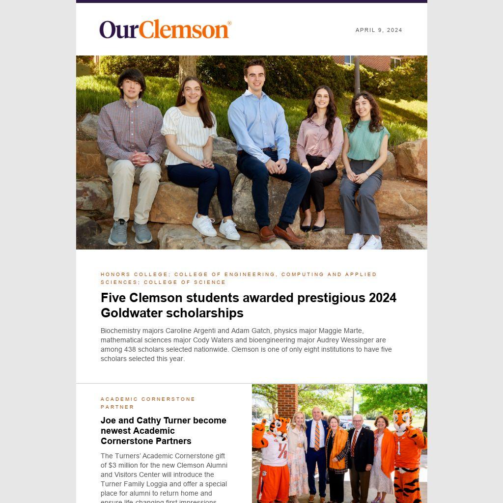Biochemistry majors Caroline Argenti and Adam Gatch, physics major Maggie Marte, mathematical sciences major Cody Waters and bioengineering major Audrey Wessinger are among 438 scholars selected nationwide. Clemson is one of only eight institutions to have five scholars selected this year.