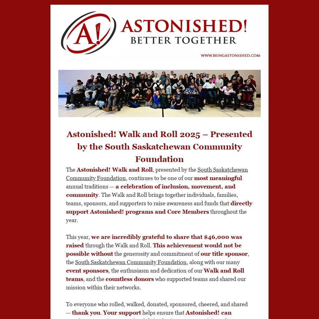 The Astonished! Walk and Roll, presented by the South Saskatchewan Community Foundation, continues to be one of our most meaningful annual traditions — a celebration of inclusion, movement, and community. The Walk and Roll brings together individuals, families, teams, sponsors, and supporters to raise awareness and funds that directly support Astonished! programs and Core Members throughout the year.