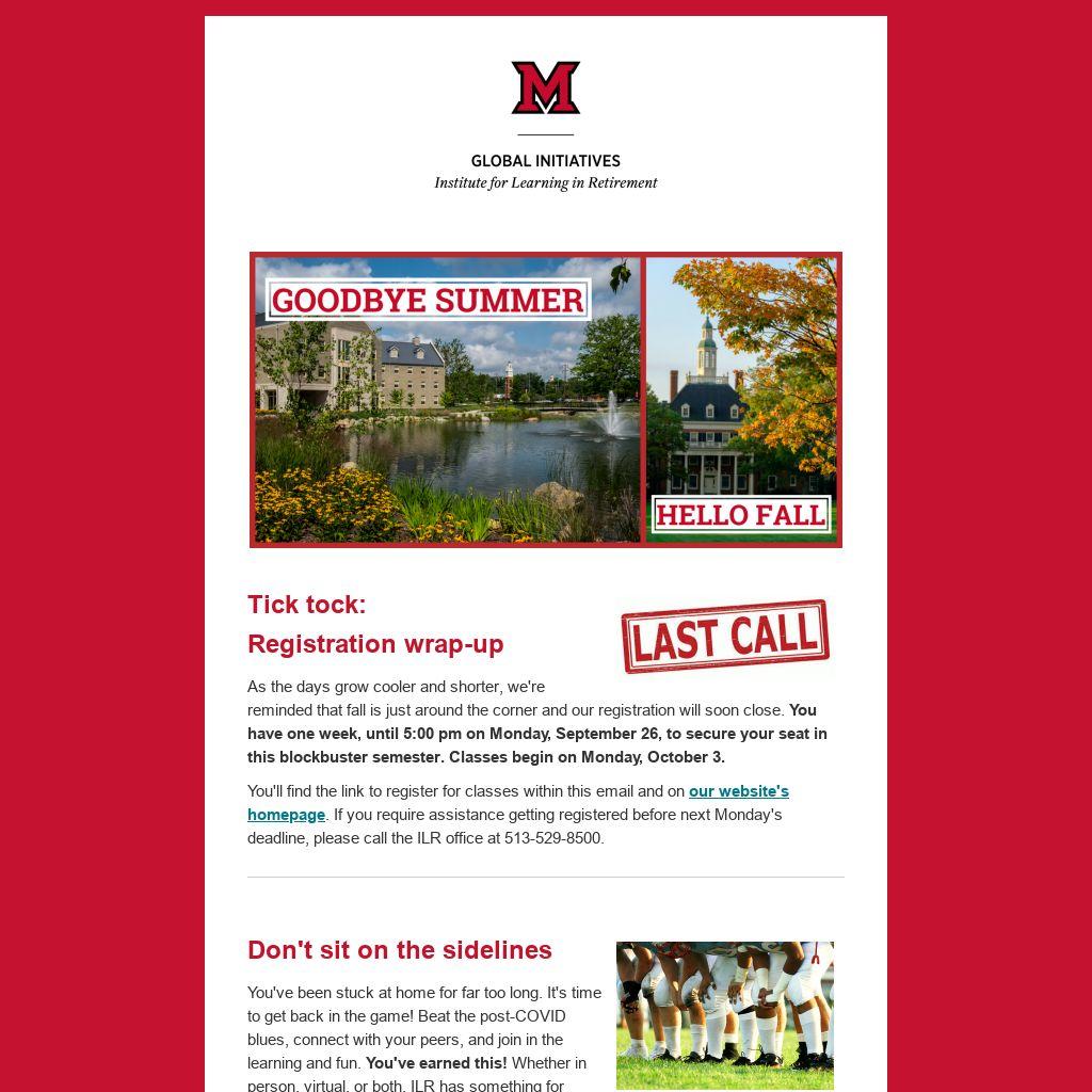 You'll find the link to register for classes within this email and on our website's homepage. If you require assistance getting registered before next Monday's deadline, please call the ILR office at 513-529-8500.