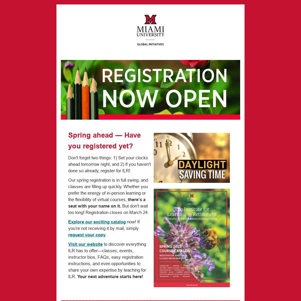 Don't forget two things: 1) Set your clocks ahead tomorrow night, and 2) If you haven't done so already, register for ILR!