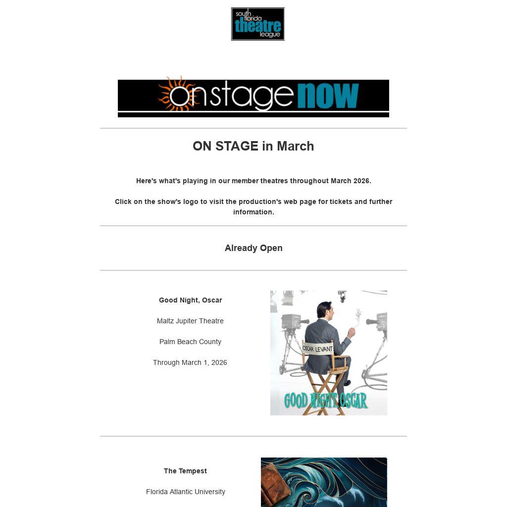 Here's what's playing in our member theatres throughout March 2026. Click on the show's logo to visit the production's web page for tickets and further information.