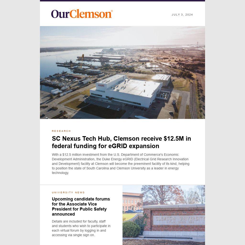 With a $12.5 million investment from the U.S. Department of Commerce's Economic Development Administration, the Duke Energy eGRID (Electrical Grid Research Innovation and Development) facility at Clemson will become the preeminent facility of its kind, helping to position the state of South Carolina and Clemson University as a leader in energy technology.