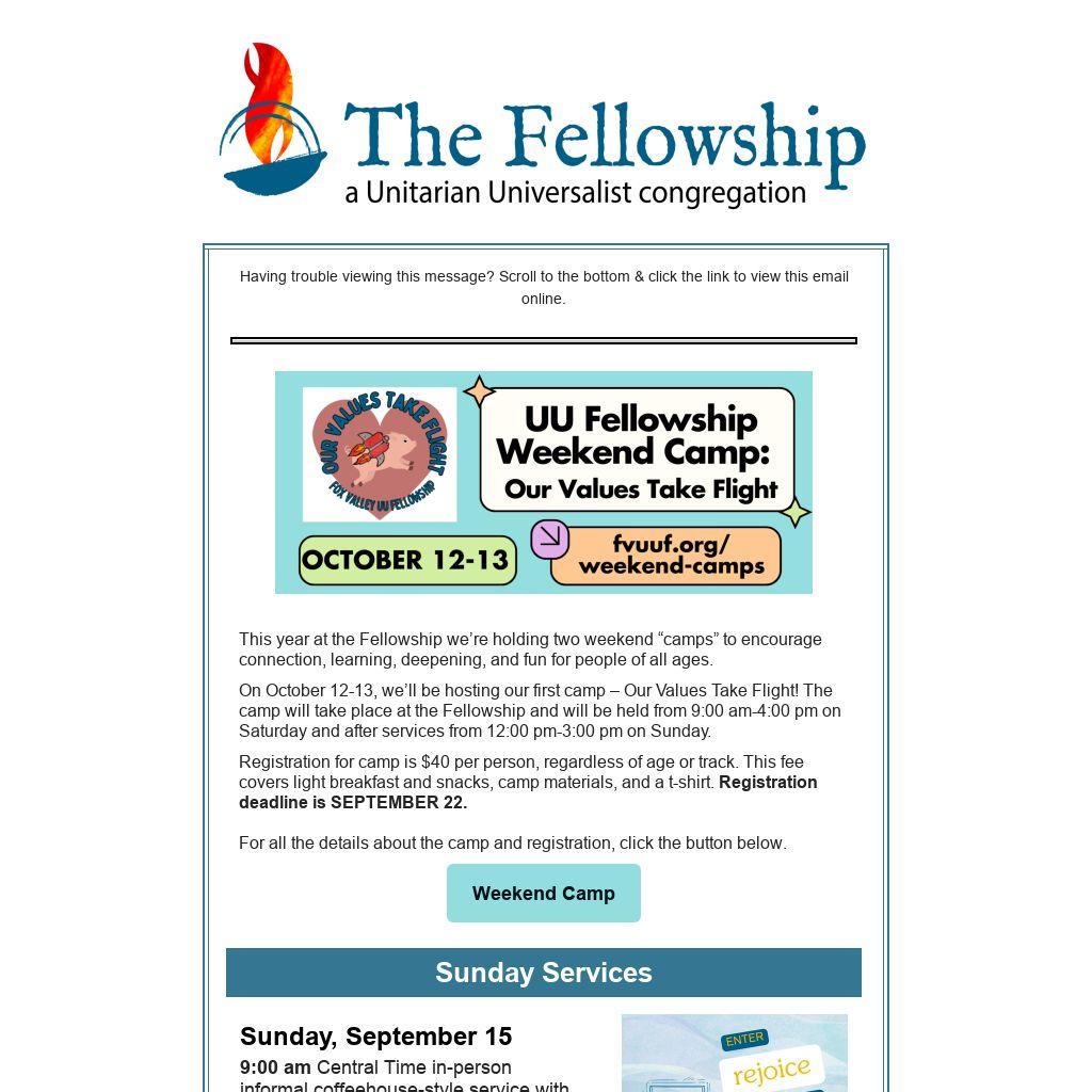 On October 12-13, we’ll be hosting our first camp – Our Values Take Flight! The camp will take place at the Fellowship and will be held from 9:00 am-4:00 pm on Saturday and after services from 12:00 pm-3:00 pm on Sunday.