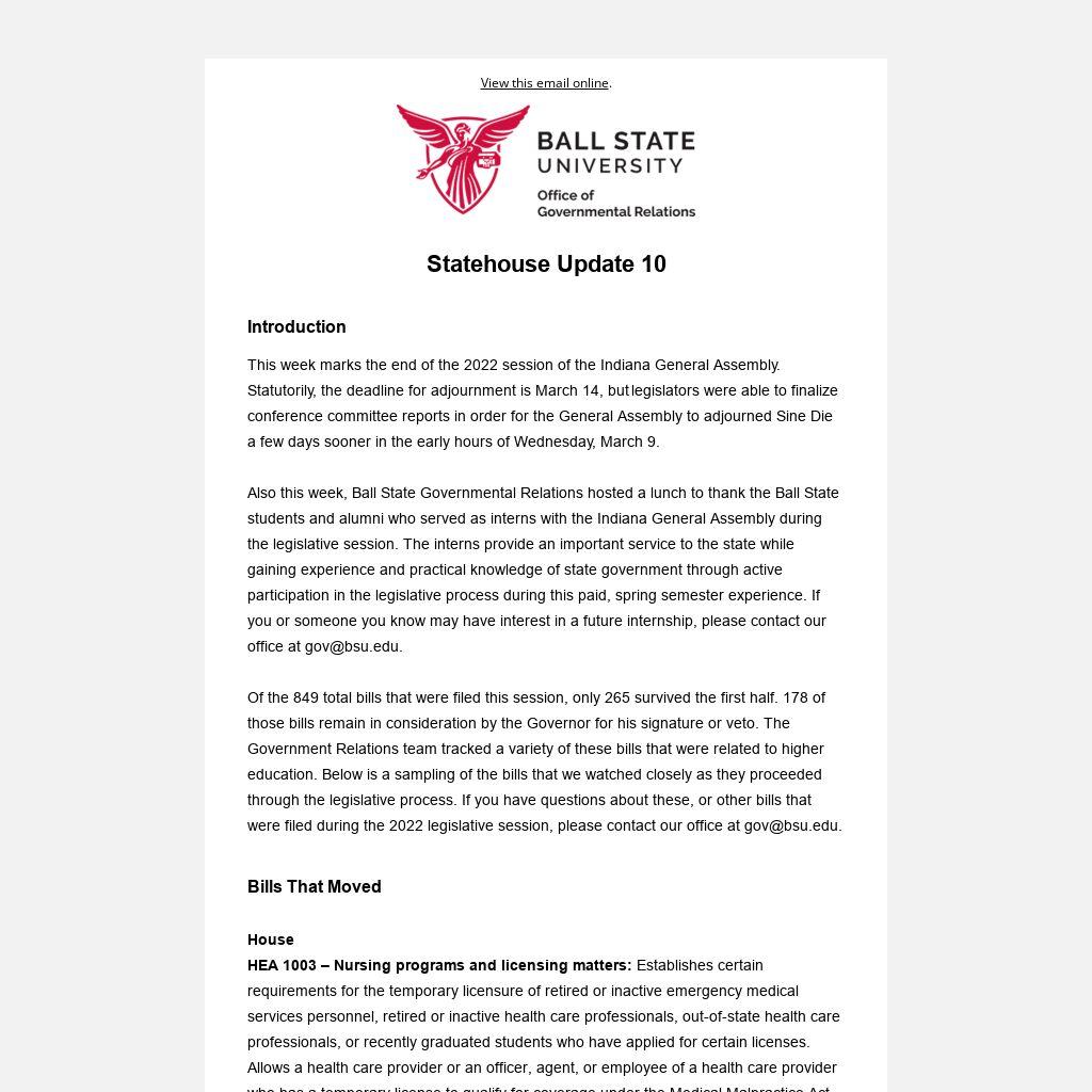 The Governmental Relations team would like to thank you for the support and assistance provided during the 2022 legislative session. It is a pleasure to represent Ball State University at the Statehouse and to share with lawmakers all the great things happening at our institutions. The good work that happens on campus creates a great deal of goodwill with our policymakers and is recognized at the Statehouse.
