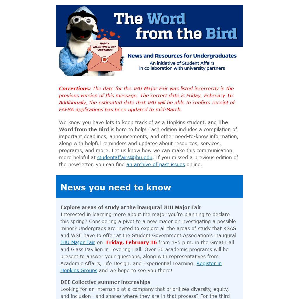 The Word from the Bird is here to help! Each edition includes a compilation of important deadlines, announcements, and other need-to-know information, along with helpful reminders and updates about resources, services, programs, and more. Let us know how we can make this communication more helpful at studentaffairs@jhu.edu. If you missed a previous edition of the newsletter, you can find an archive of past issues online.