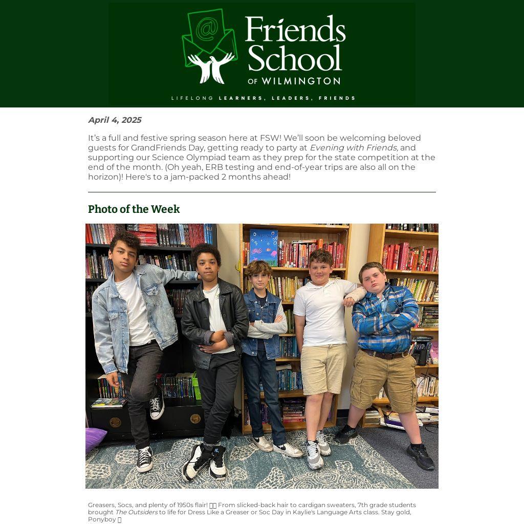 It’s a full and festive spring season here at FSW! We’ll soon be welcoming beloved guests for GrandFriends Day, getting ready to party at Evening with Friends, and supporting our Science Olympiad team as they prep for the state competition at the end of the month. (Oh yeah, ERB testing and end-of-year trips are also all on the horizon)! Here's to a jam-packed 2 months ahead!