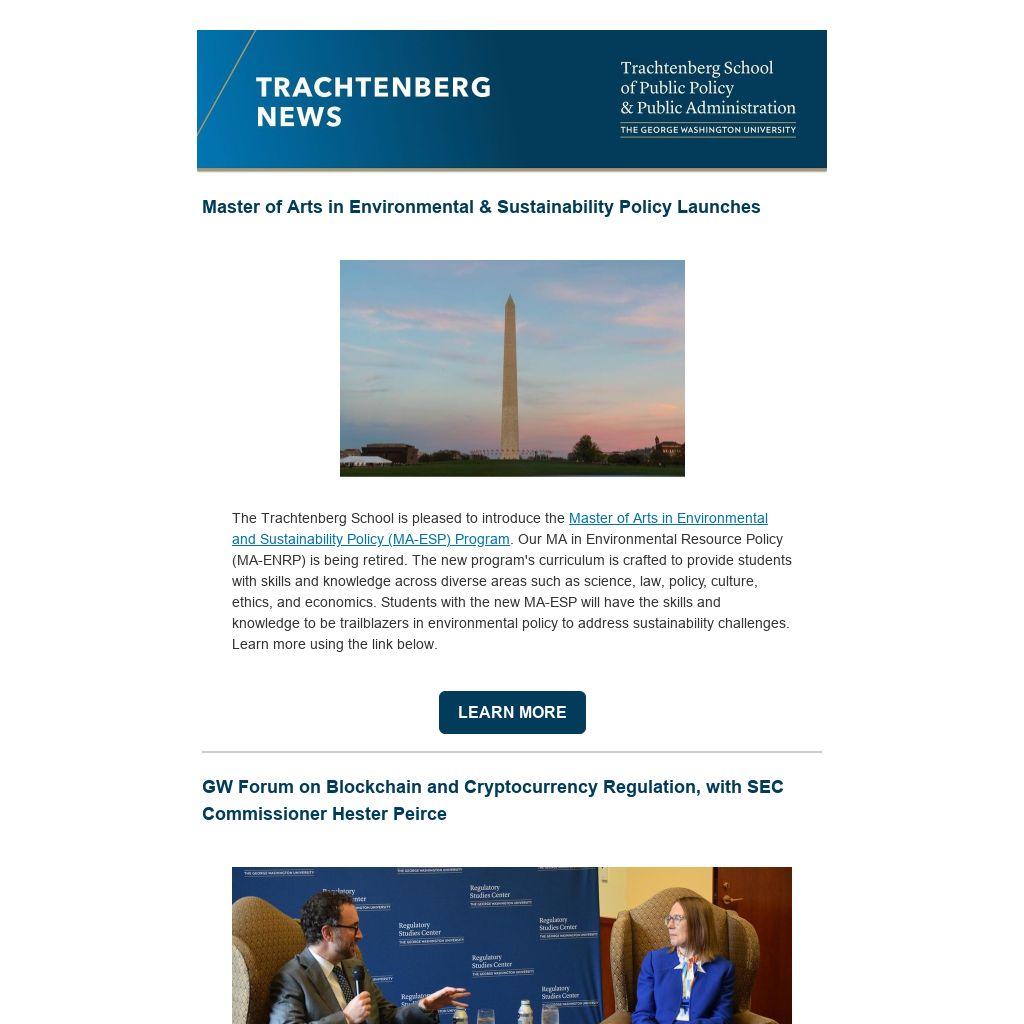 The Trachtenberg School is pleased to introduce the Master of Arts in Environmental and Sustainability Policy (MA-ESP) Program. Our MA in Environmental Resource Policy (MA-ENRP) is being retired. The new program's curriculum is crafted to provide students with skills and knowledge across diverse areas such as science, law, policy, culture, ethics, and economics. Students with the new MA-ESP will have the skills and knowledge to be trailblazers in environmental policy to address sustainability challenges. Learn more using the link below.