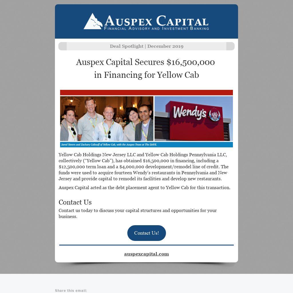 Auspex Capital acted as the debt placement agent to Yellow Cab for this transaction.
