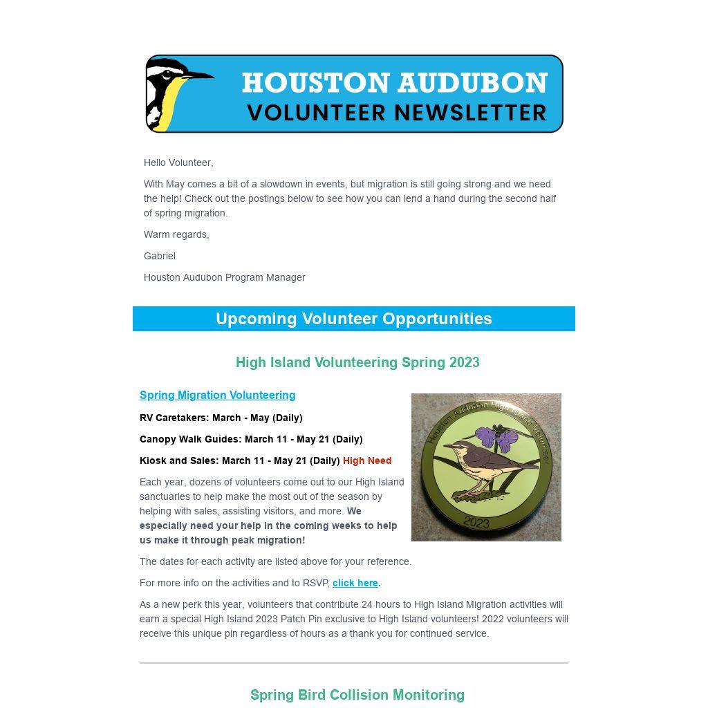 Each year, dozens of volunteers come out to our High Island sanctuaries to help make the most out of the season by helping with sales, assisting visitors, and more. We especially need your help in the coming weeks to help us make it through peak migration!