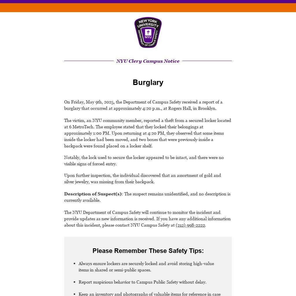 On Friday, May 9th, 2025, the Department of Campus Safety received a report of a burglary that occurred at approximately 4:20 p.m., at Rogers Hall, in Brooklyn.