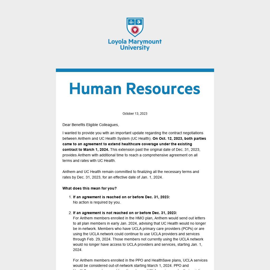 Your understanding and support during this continuing process are greatly appreciated. If you have any questions or require further information, please do not hesitate to reach out to LMU Human Resources at hr@lmu.edu.