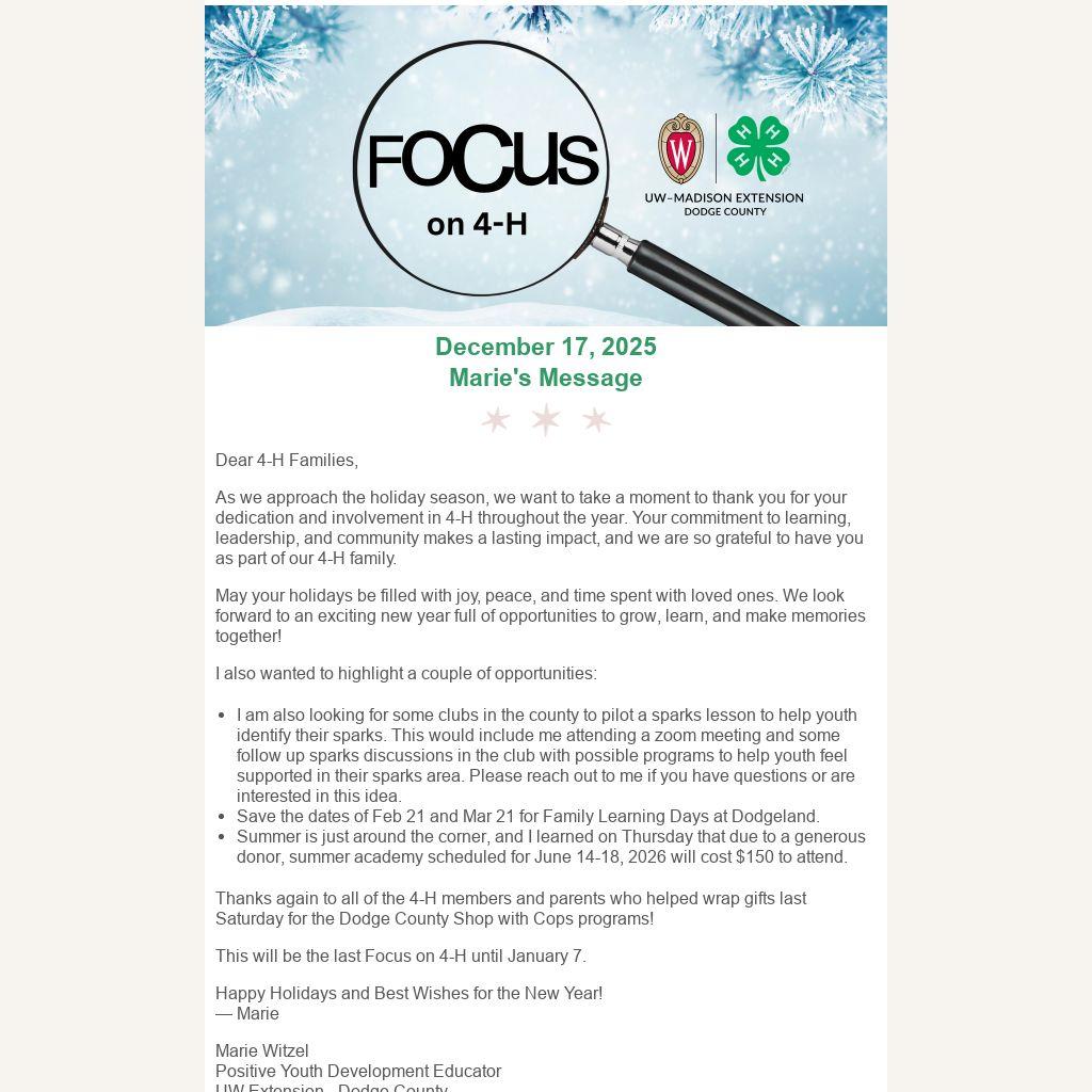 Please send any 4-H or youth development related emails to marie.witzel@wisc.edu
