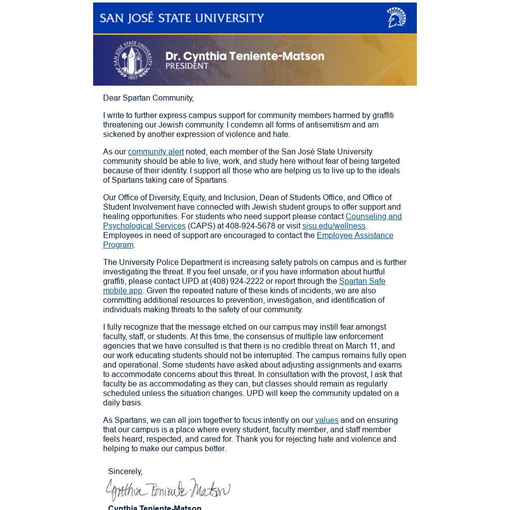 As our community alert noted, each member of the San José State University community should be able to live, work, and study here without fear of being targeted because of their identity. I support all those who are helping us to live up to the ideals of Spartans taking care of Spartans.