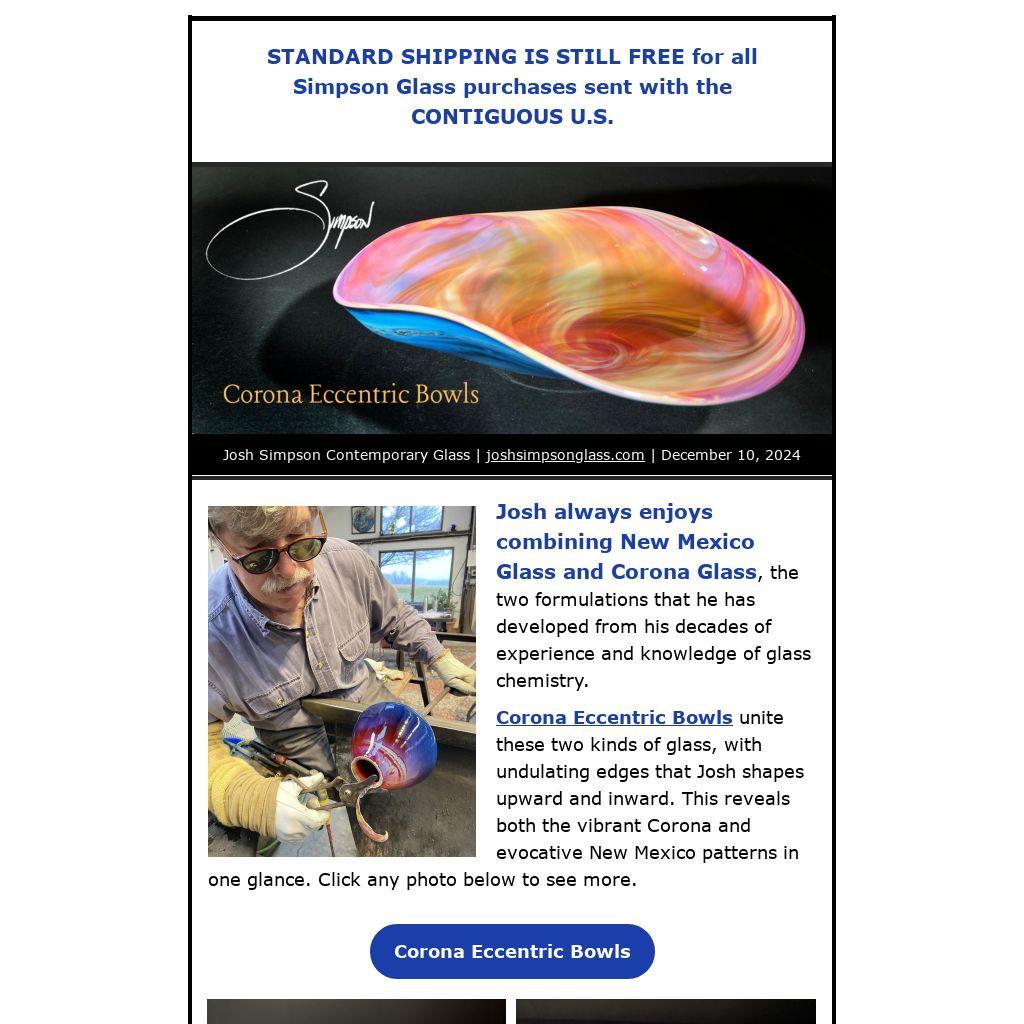 Corona Eccentric Bowls unite these two kinds of glass, with undulating edges that Josh shapes upward and inward. This reveals both the vibrant Corona and evocative New Mexico patterns in one glance. Click any photo below to see more.