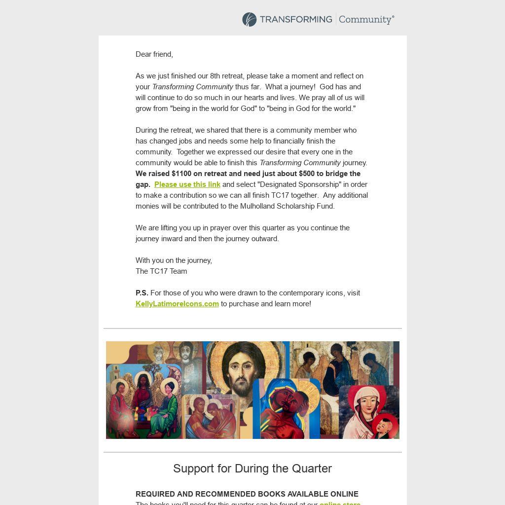 During the retreat, we shared that there is a community member who has changed jobs and needs some help to financially finish the community. Together we expressed our desire that every one in the community would be able to finish this Transforming Community journey. We raised $1100 on retreat and need just about $500 to bridge the gap. Please use this link and select "Designated Sponsorship" in order to make a contribution so we can all finish TC17 together. Any additional monies will be contributed to the Mulholland Scholarship Fund.