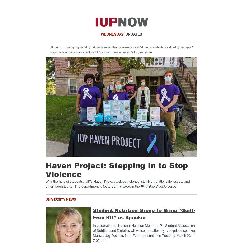Distributed to IUP employees and students four days a week, IUP Now is the official newsletter of Indiana University of Pennsylvania. It features news from across the IUP website, compiled by the Division of Marketing and Communications. Find out how to get your news and events in IUP Now.
