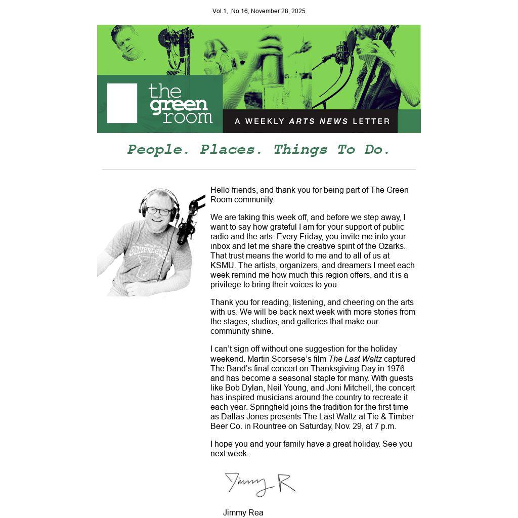 We are taking this week off, and before we step away, I want to say how grateful I am for your support of public radio and the arts. Every Friday, you invite me into your inbox and let me share the creative spirit of the Ozarks. That trust means the world to me and to all of us at KSMU. The artists, organizers, and dreamers I meet each week remind me how much this region offers, and it is a privilege to bring their voices to you.