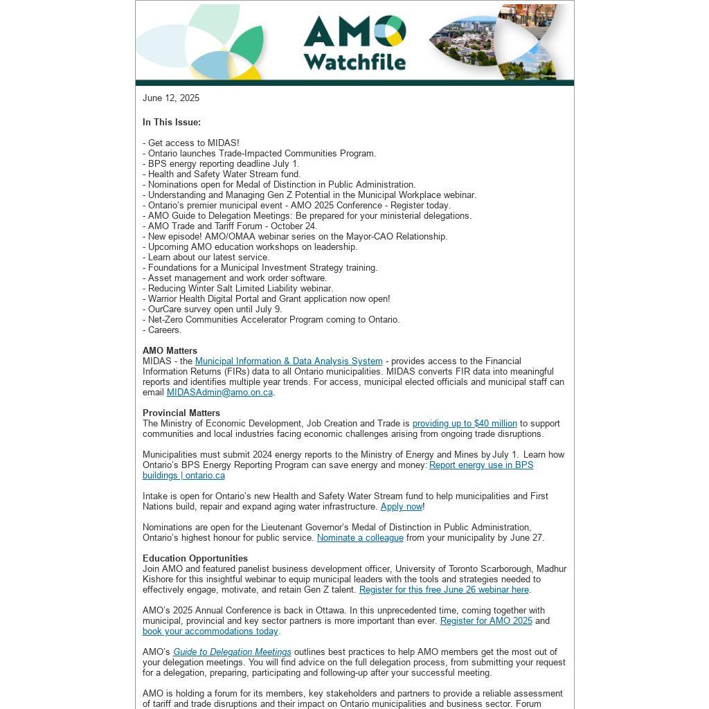 *Disclaimer: The Association of Municipalities of Ontario (AMO) is unable to provide any warranty regarding the accuracy or completeness of third-party submissions. Distribution of these items does not imply an endorsement of the views, information or services mentioned.