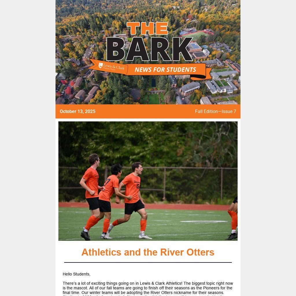 There’s a lot of exciting things going on in Lewis & Clark Athletics! The biggest topic right now is the mascot. All of our fall teams are going to finish off their seasons as the Pioneers for the final time. Our winter teams will be adopting the River Otters nickname for their seasons. Starting in 2026, all of our Lewis & Clark varsity athletics teams will be represented by the River Otters. Have some fun ideas for cheers or slogans - send me an email (orenskys@lclark.edu). Do you want to cheer on the River Otters for our first-ever games as River Otters? Check out the list below for our home openers for men’s and women’s swimming and basketball.