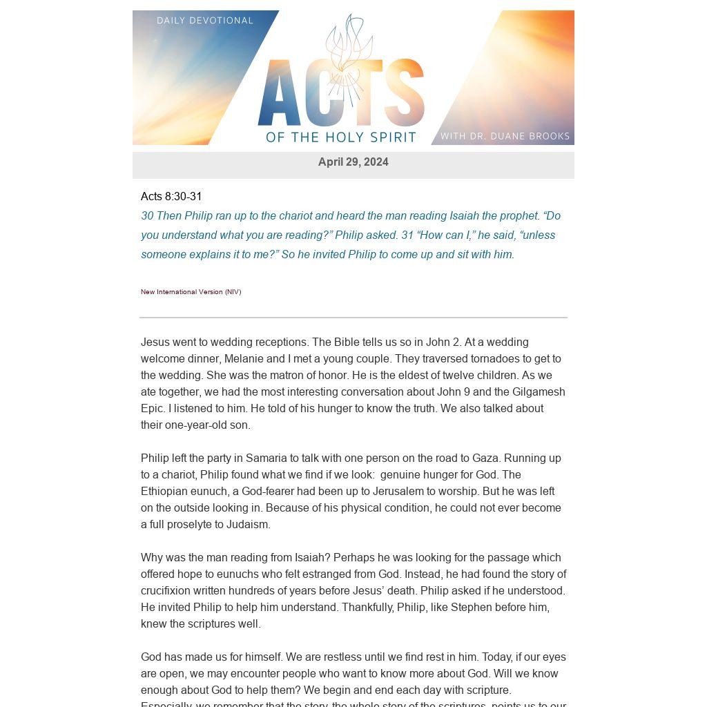 Philip left the party in Samaria to talk with one person on the road to Gaza. Running up to a chariot, Philip found what we find if we look: genuine hunger for God. The Ethiopian eunuch, a God-fearer had been up to Jerusalem to worship. But he was left on the outside looking in. Because of his physical condition, he could not ever become a full proselyte to Judaism.