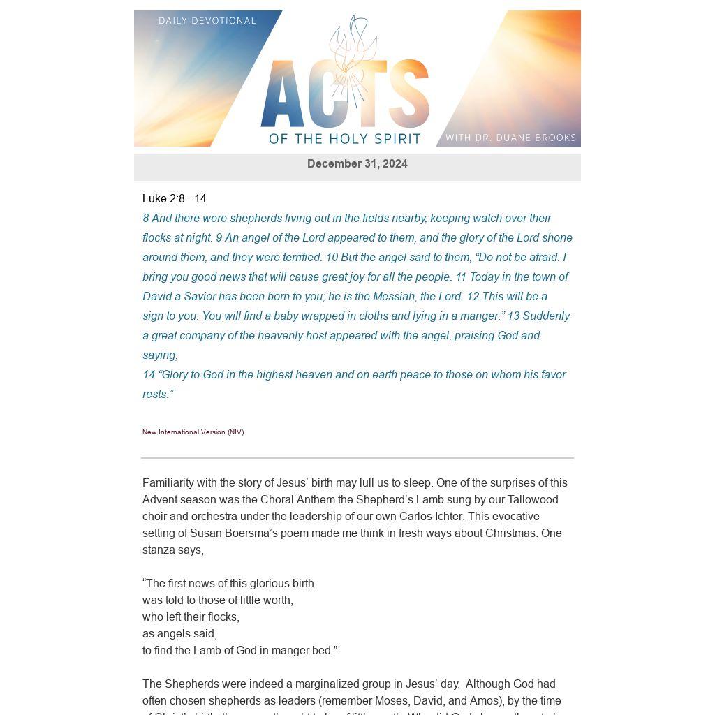 The Shepherds were indeed a marginalized group in Jesus’ day. Although God had often chosen shepherds as leaders (remember Moses, David, and Amos), by the time of Christ’s birth, they were thought to be of little worth. Why did God choose them to be first recipients of the good news? They were doing their job. God’s next plan for us so often comes when we are faithfully fulfilling God’s revealed will. Moses was watching flocks when he saw the burning bush. God comes to those who are faithfully fulfilling their work.