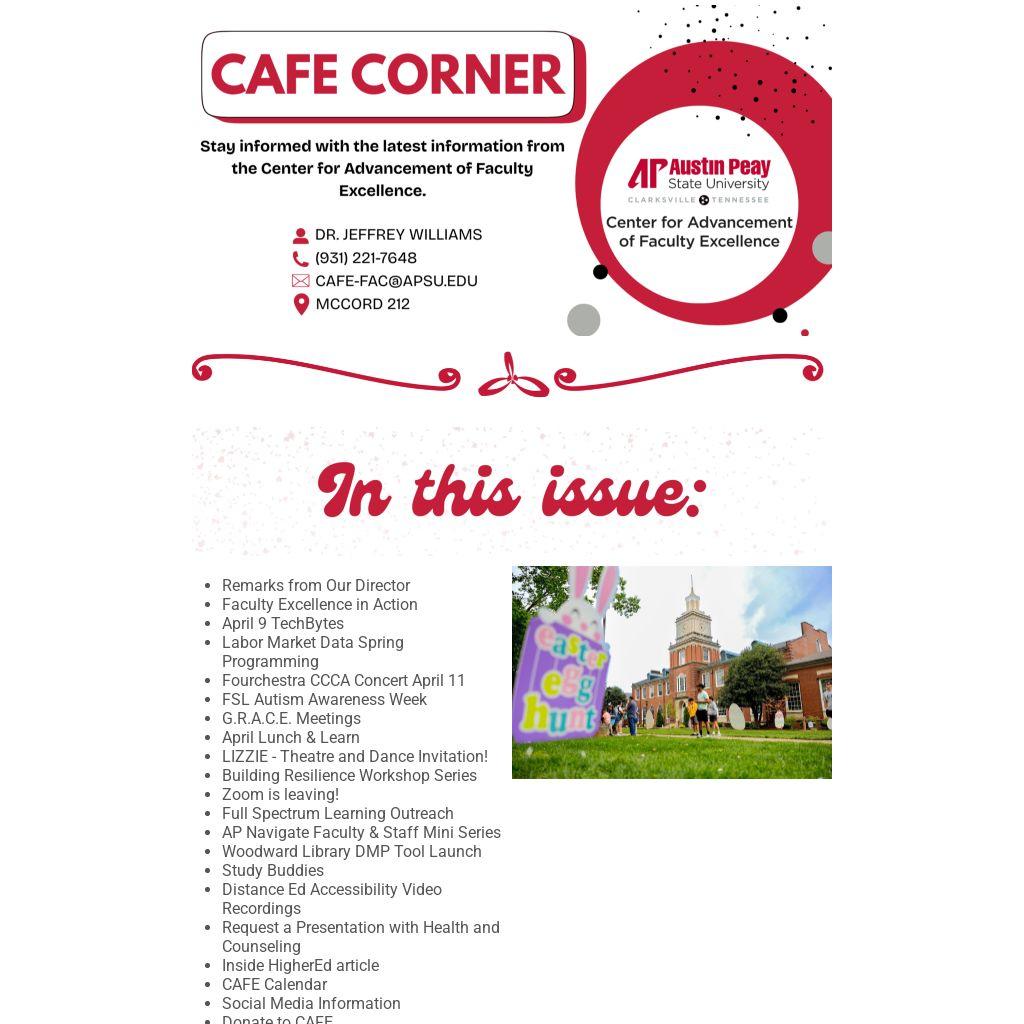 As always, I welcome your ideas on how CAFE can better serve you. Please don't hesitate to reach out at williamsjj@apsu.edu or 931-221-7648.