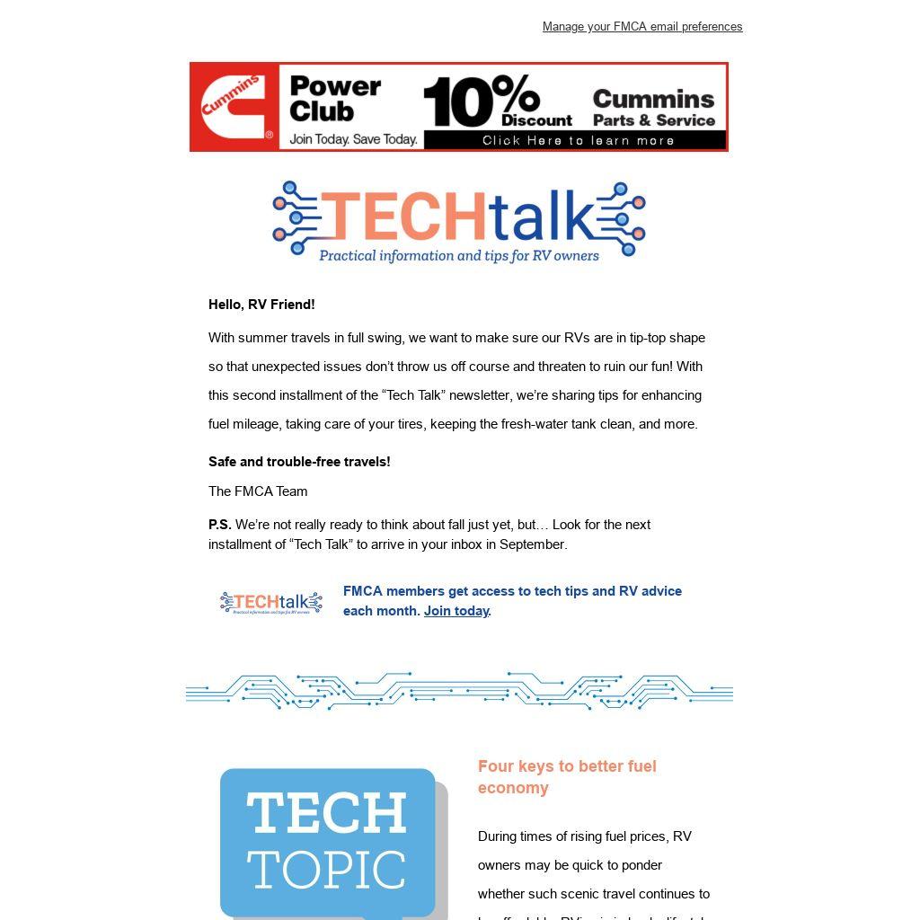 With summer travels in full swing, we want to make sure our RVs are in tip-top shape so that unexpected issues don’t throw us off course and threaten to ruin our fun! With this second installment of the “Tech Talk” newsletter, we’re sharing tips for enhancing fuel mileage, taking care of your tires, keeping the fresh-water tank clean, and more.
