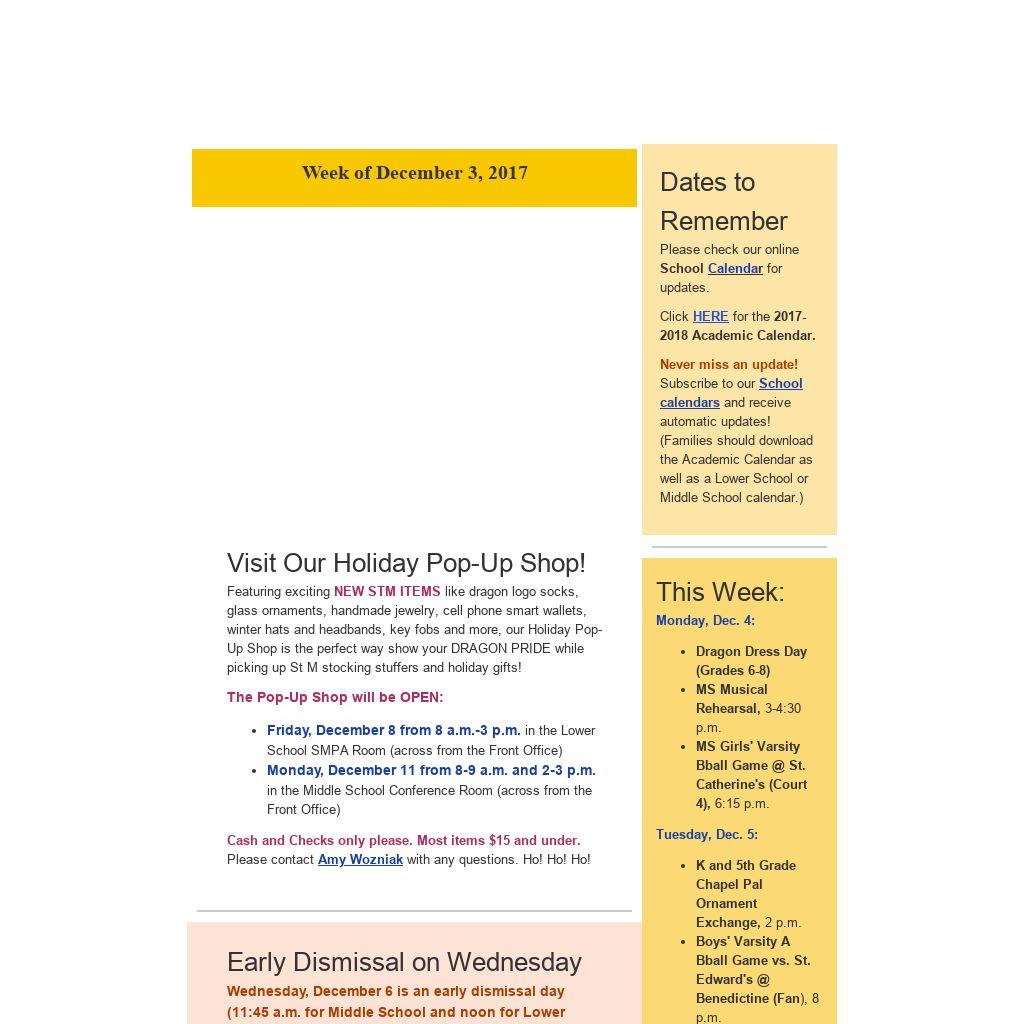 Friday, Dec. 8: - St M Holiday Pop-Up Shop, 8 a.m.-3 p.m., Lower School SMPA Room