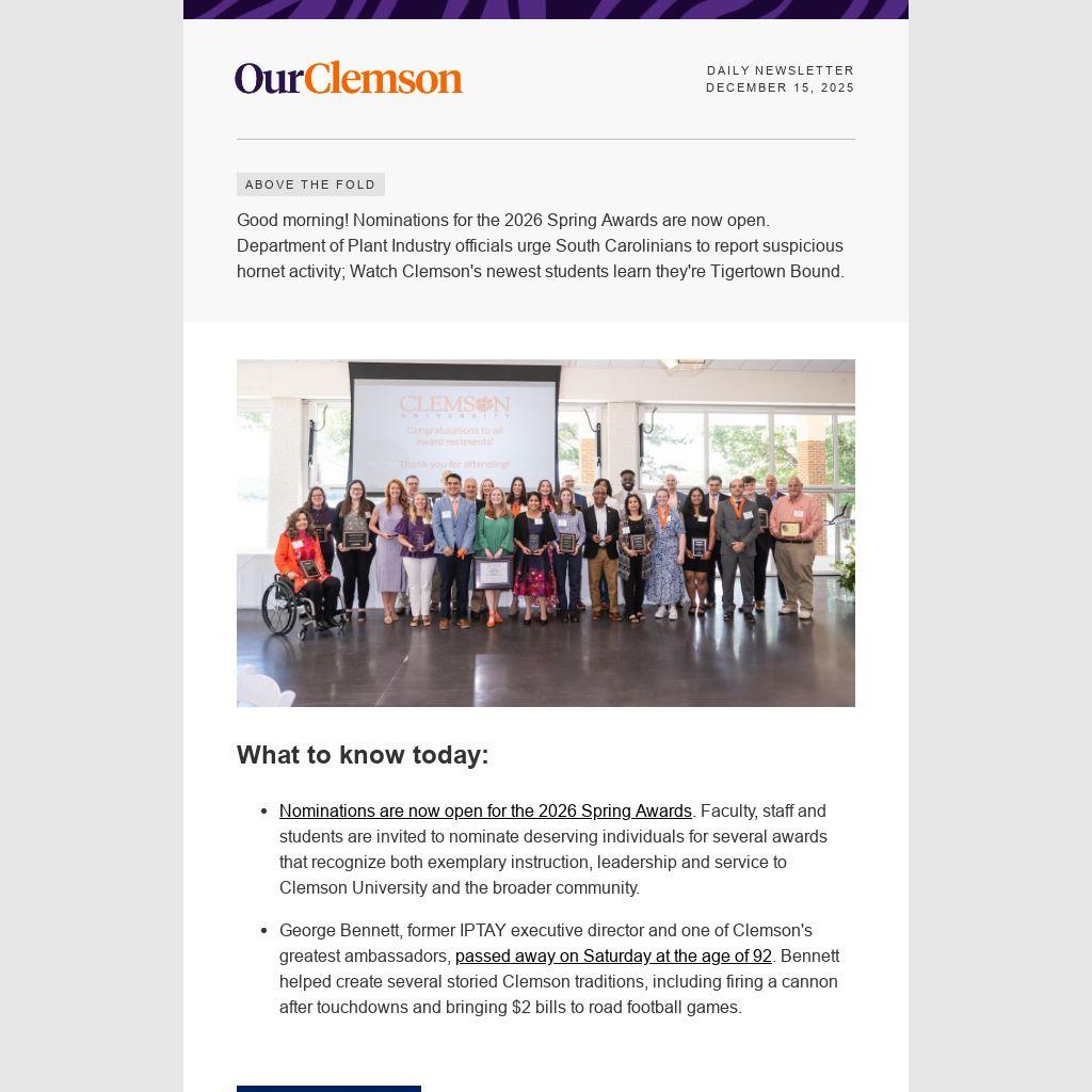 Good morning! Nominations for the 2026 Spring Awards are now open. Department of Plant Industry officials urge South Carolinians to report suspicious hornet activity; Watch Clemson's newest students learn they're Tigertown Bound.