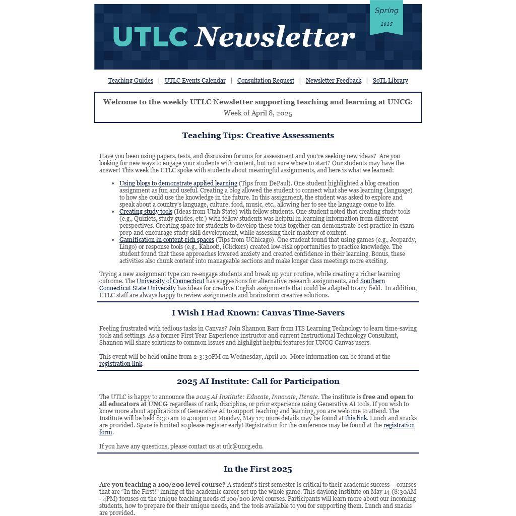 Welcome to the weekly UTLC Newsletter supporting teaching and learning at UNCG: