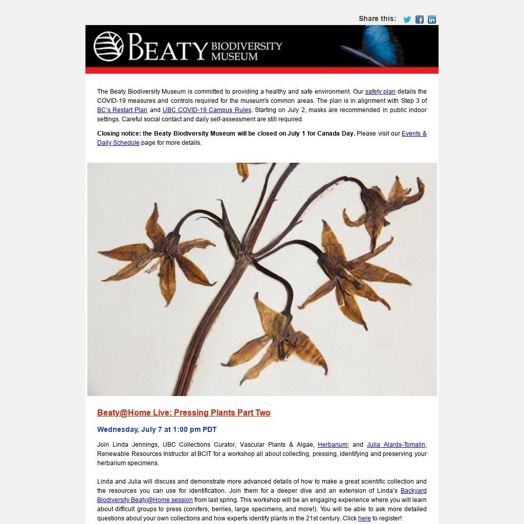 Closing notice: the Beaty Biodiversity Museum will be closed on July 1 for Canada Day. Please visit our Events & Daily Schedule page for more details.