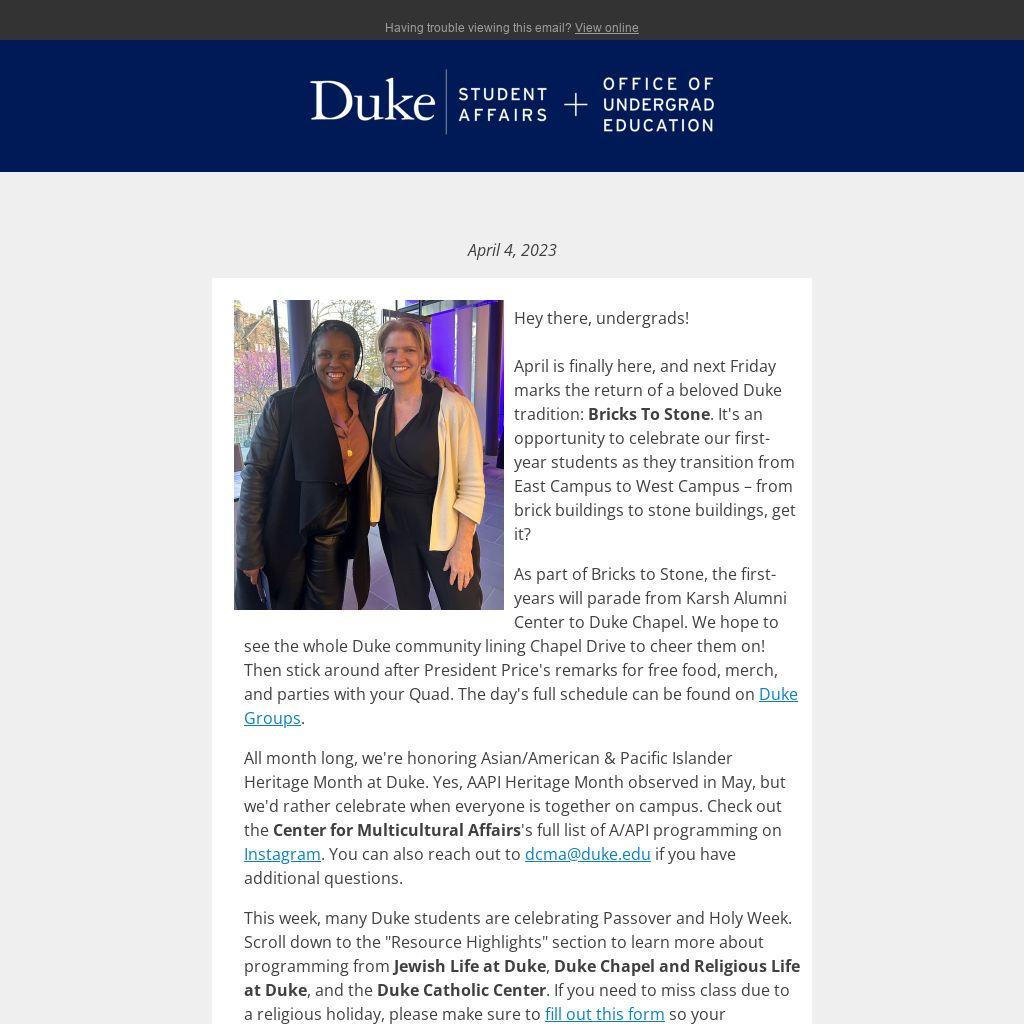 This week, many Duke students are celebrating Passover and Holy Week. Scroll down to the "Resource Highlights" section to learn more about programming from Jewish Life at Duke, Duke Chapel and Religious Life at Duke, and the Duke Catholic Center. If you need to miss class due to a religious holiday, please make sure to fill out this form so your professors are aware. Chag Pesach Sameach, and Happy Easter!