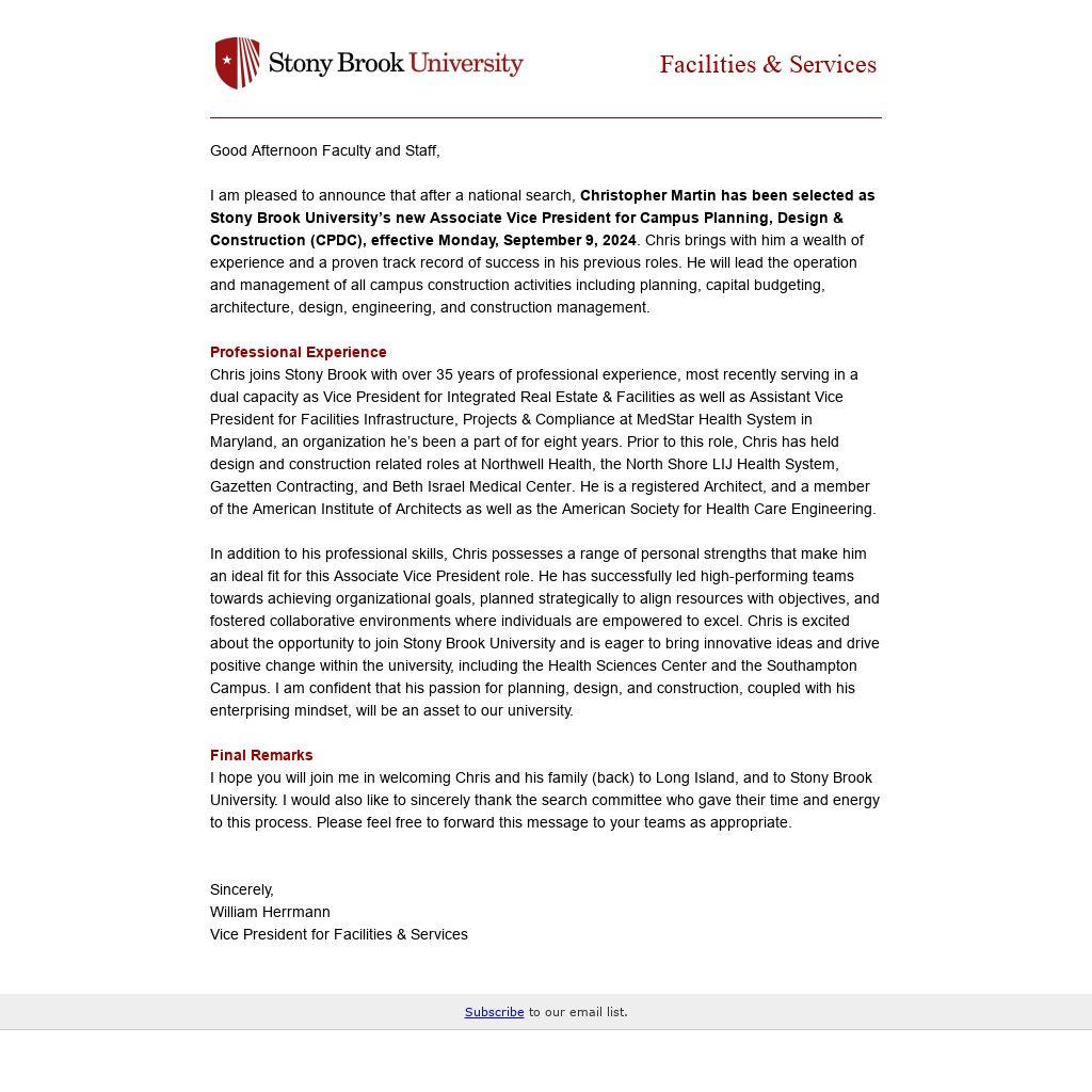I am pleased to announce that after a national search, Christopher Martin has been selected as Stony Brook University’s new Associate Vice President for Campus Planning, Design & Construction (CPDC), effective Monday, September 9, 2024. Chris brings with him a wealth of experience and a proven track record of success in his previous roles. He will lead the operation and management of all campus construction activities including planning, capital budgeting, architecture, design, engineering, and construction management.