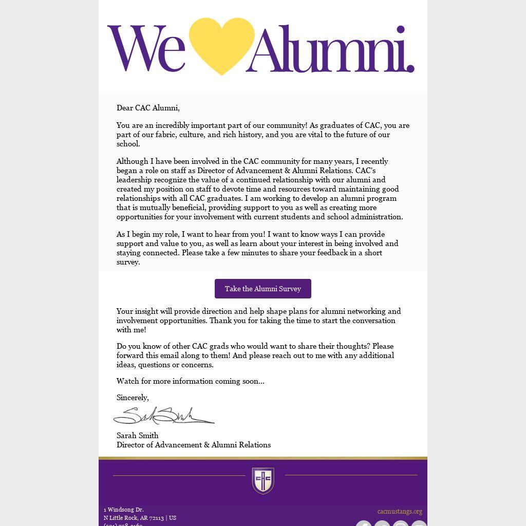 You are an incredibly important part of our community! As graduates of CAC, you are part of our fabric, culture, and rich history, and you are vital to the future of our school.