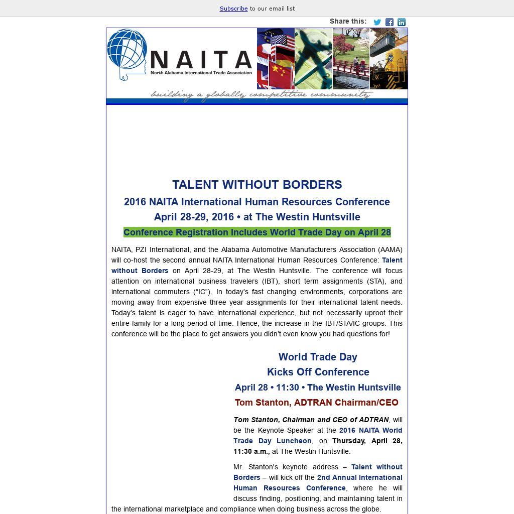 NAITA, PZI International, and the Alabama Automotive Manufacturers Association (AAMA) will co-host the second annual NAITA International Human Resources Conference: Talent without Borders on April 28-29, at The Westin Huntsville. The conference will focus attention on international business travelers (IBT), short term assignments (STA), and international commuters (“IC”). In today’s fast changing environments, corporations are moving away from expensive three year assignments for their international talent needs. Today’s talent is eager to have international experience, but not necessarily uproot their entire family for a long period of time. Hence, the increase in the IBT/STA/IC groups. This conference will be the place to get answers you didn’t even know you had questions for!