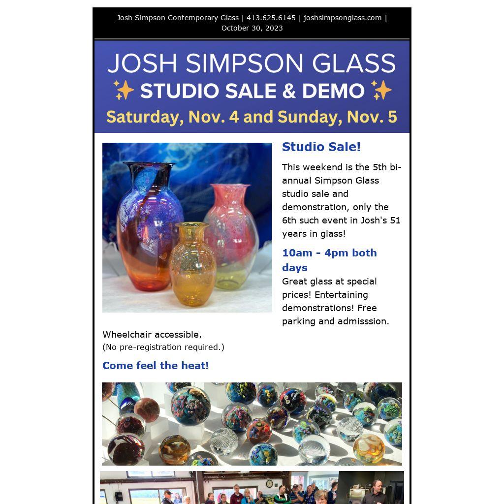This weekend is the 5th bi-annual Simpson Glass studio sale and demonstration, only the 6th such event in Josh's 51 years in glass!